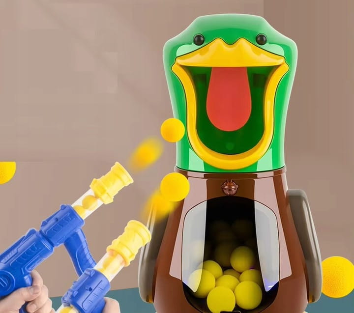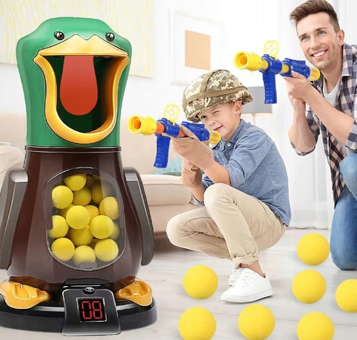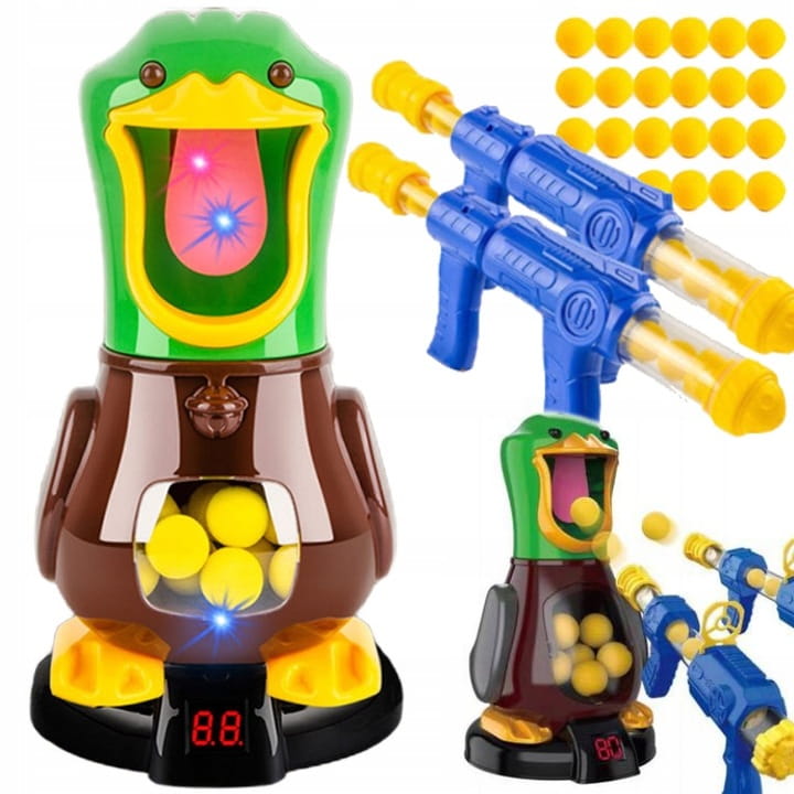 - Laden Sie die Waffe mit weichen Kugeln und schießen Sie. Bei jedem Schlag hören Sie ein Entengeräusch. Derjenige, der die meisten Punkte erzielt, gewinnt. Der Wettbewerb wird intensive Emotionen wecken! Die Spielregeln legen Sie selbst fest!