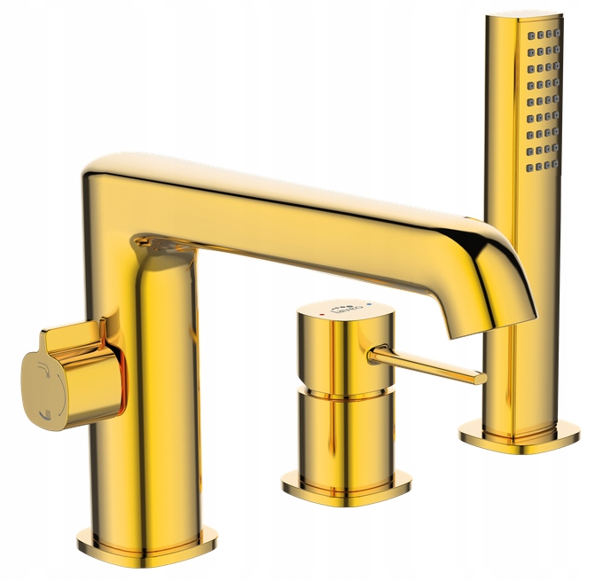 ✅ Stand-3-Loch Wannenarmatur in Gold mit gelbem Farbton. Das Modell ist für den Einbau mit Badewannen vorgesehen.