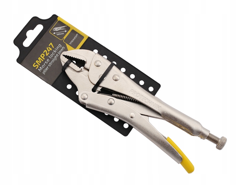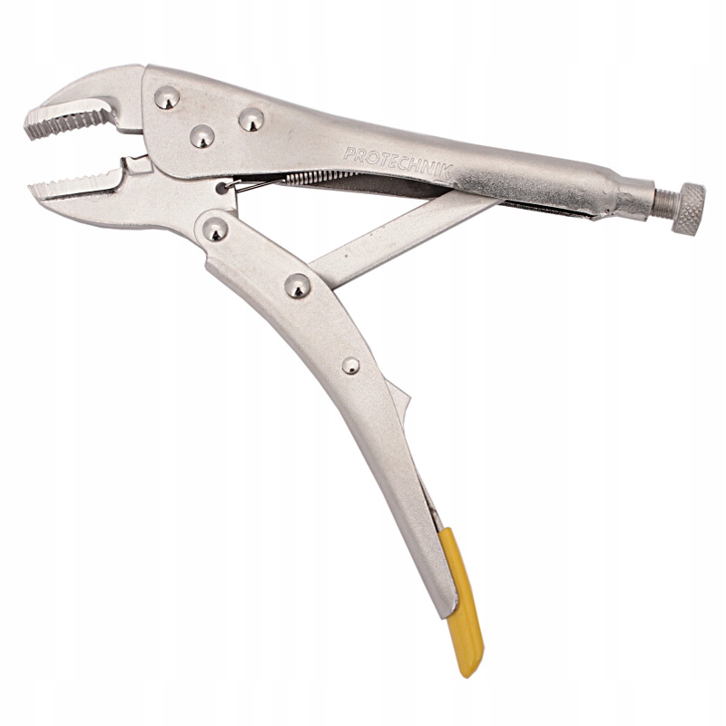 Gerade Greifzange zum sicheren Greifen runder, profilierter und flacher Gegenstände. Perfekt für Auto-, Mechanik-, Schlosser- und Schweißwerkstätten. Selbsthemmender Mechanismus mit gummibeschichtetem Hebel zum schnellen Lösen des Backendrucks. Sie haben eine Schraube zum Einstellen der Öffnung, mit der Sie die Breite des Backenabstands je nach Größe des gegriffenen Materials einstellen können.