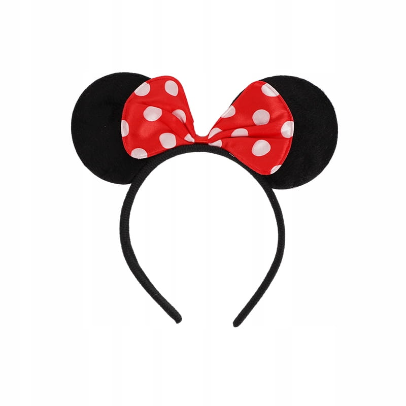 Elastisches Stirnband mit Stoffbesatz. Am Haarreif sind Mäuseohren und eine rote Schleife mit weißen Punkten befestigt.
