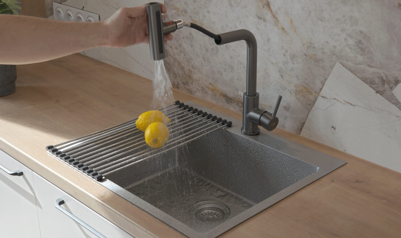 Der ausziehbare und schwenkbare Auslauf bietet volle Bewegungsfreiheit und erleichtert so das Befüllen hoher Gefäße, das Abspülen von Obst oder die Reinigung der Spüle.