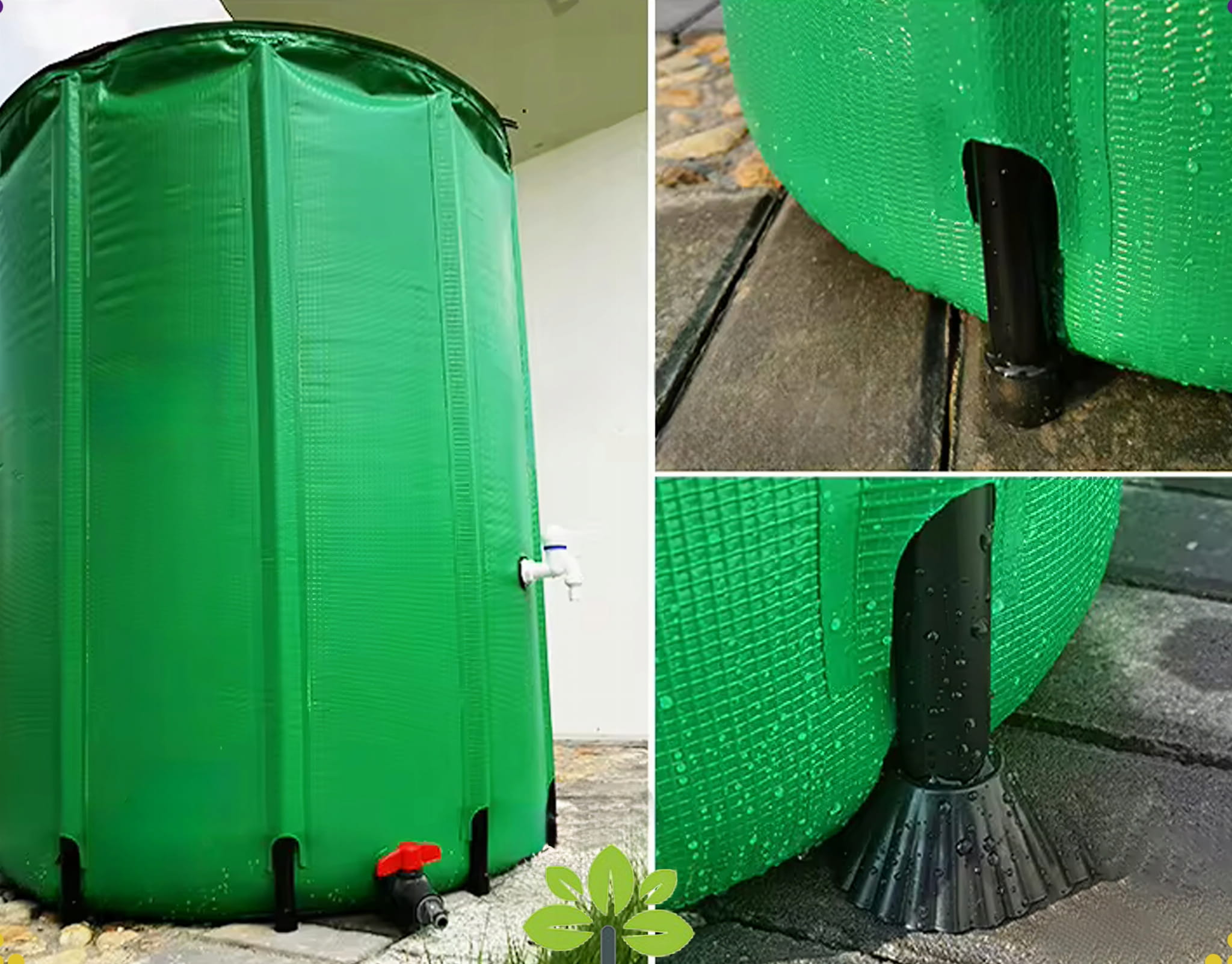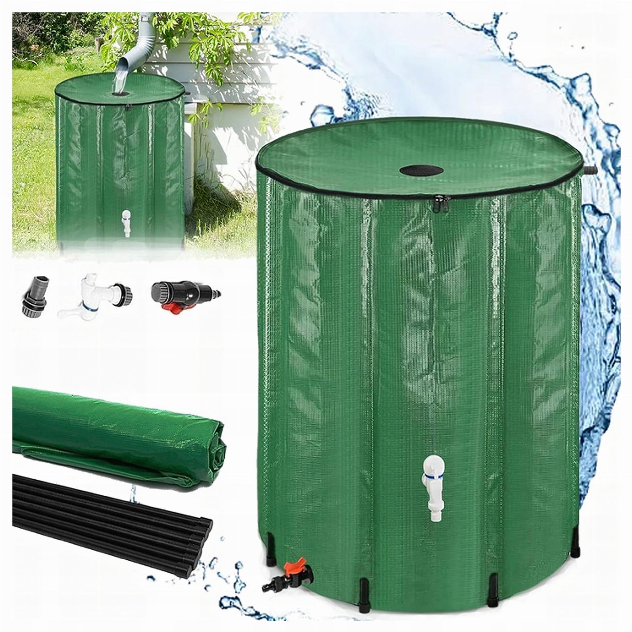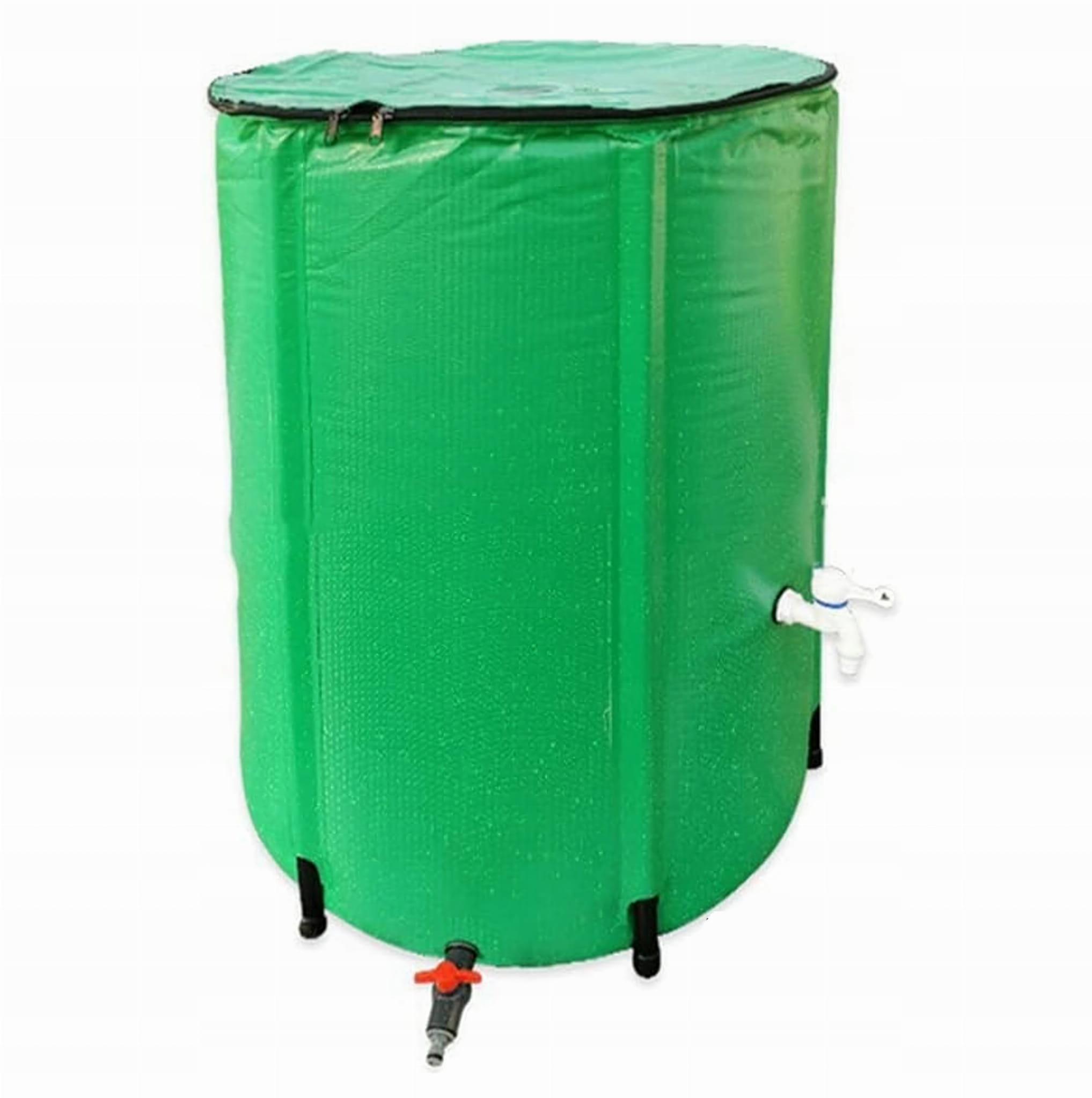 Faltbarer, flexibler Regenwassertank mit eingebautem Wasserhahn und Überlaufventil. Entwickelt, um beispielsweise aus Dachrinnen abfließendes Wasser zu sammeln, das dann zum Bewässern des Gartens, von Topfpflanzen oder zum Autowaschen verwendet werden kann.