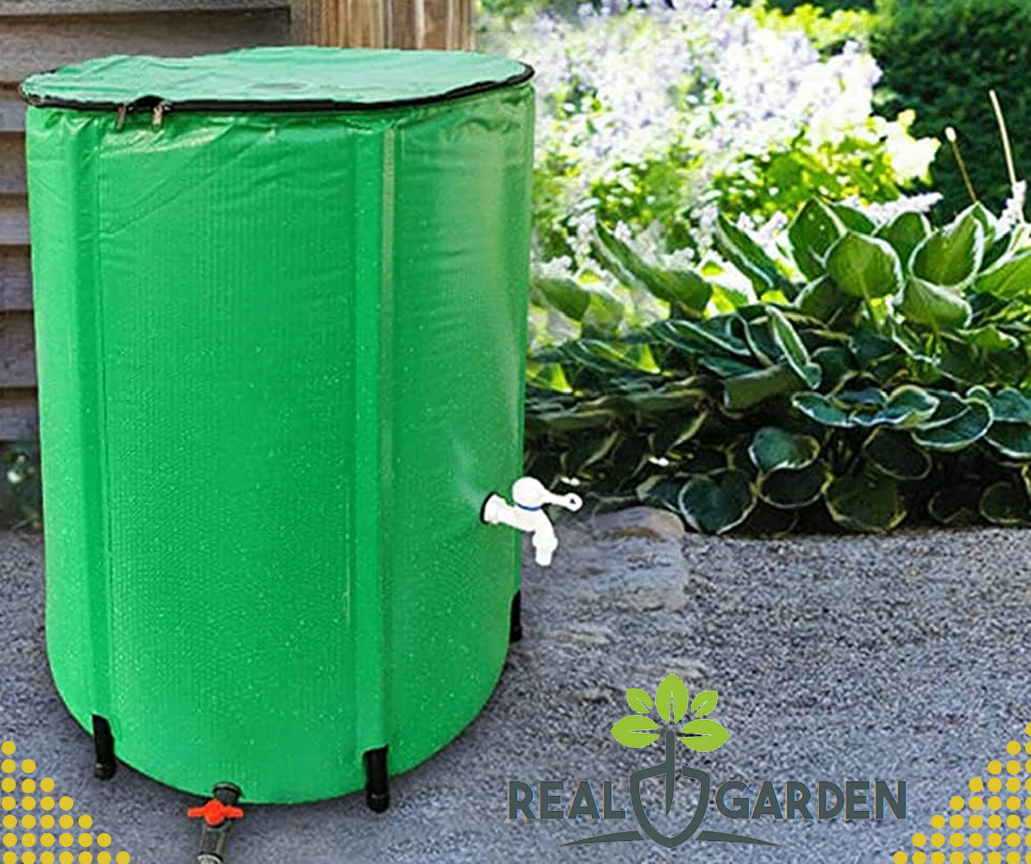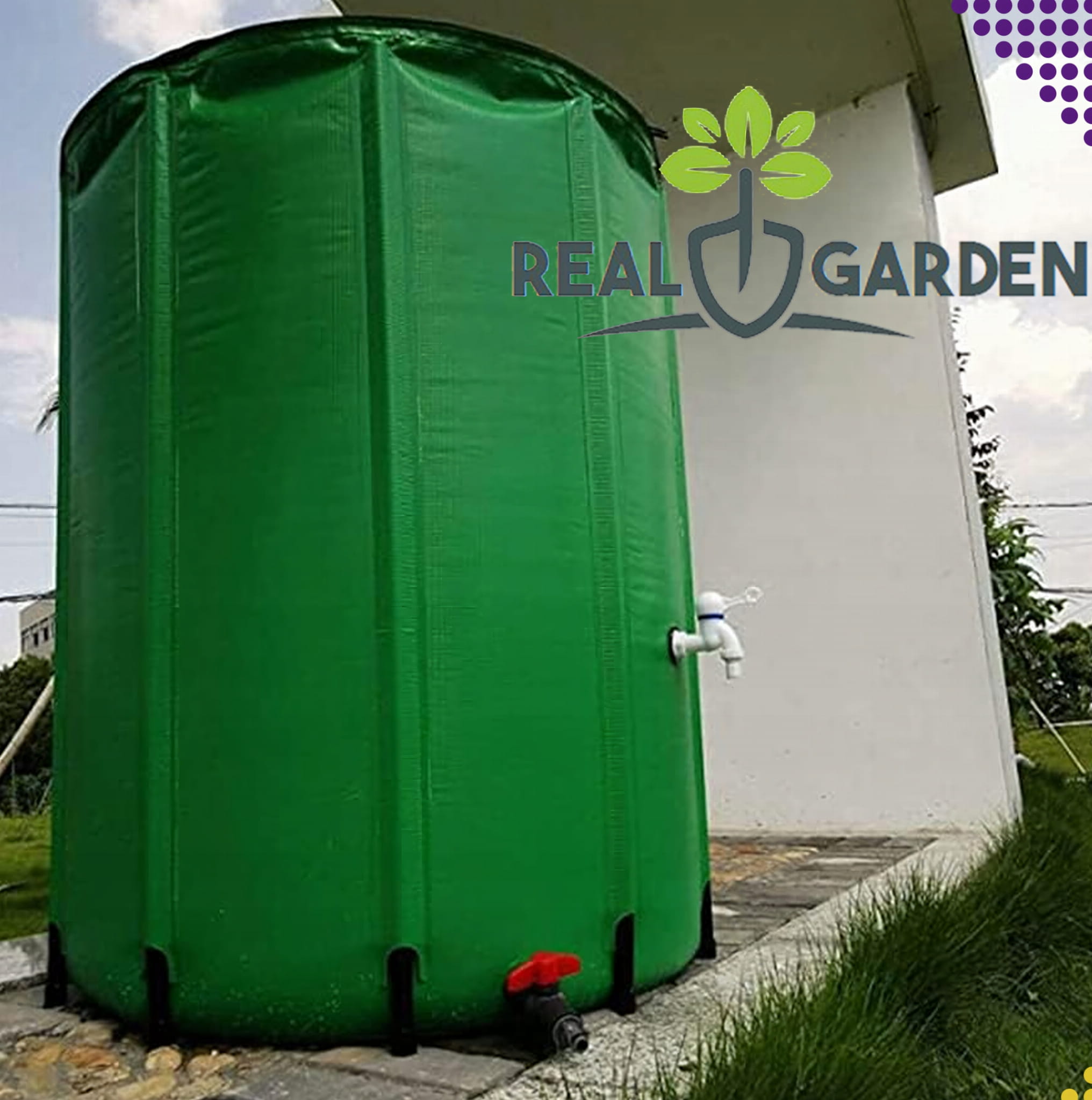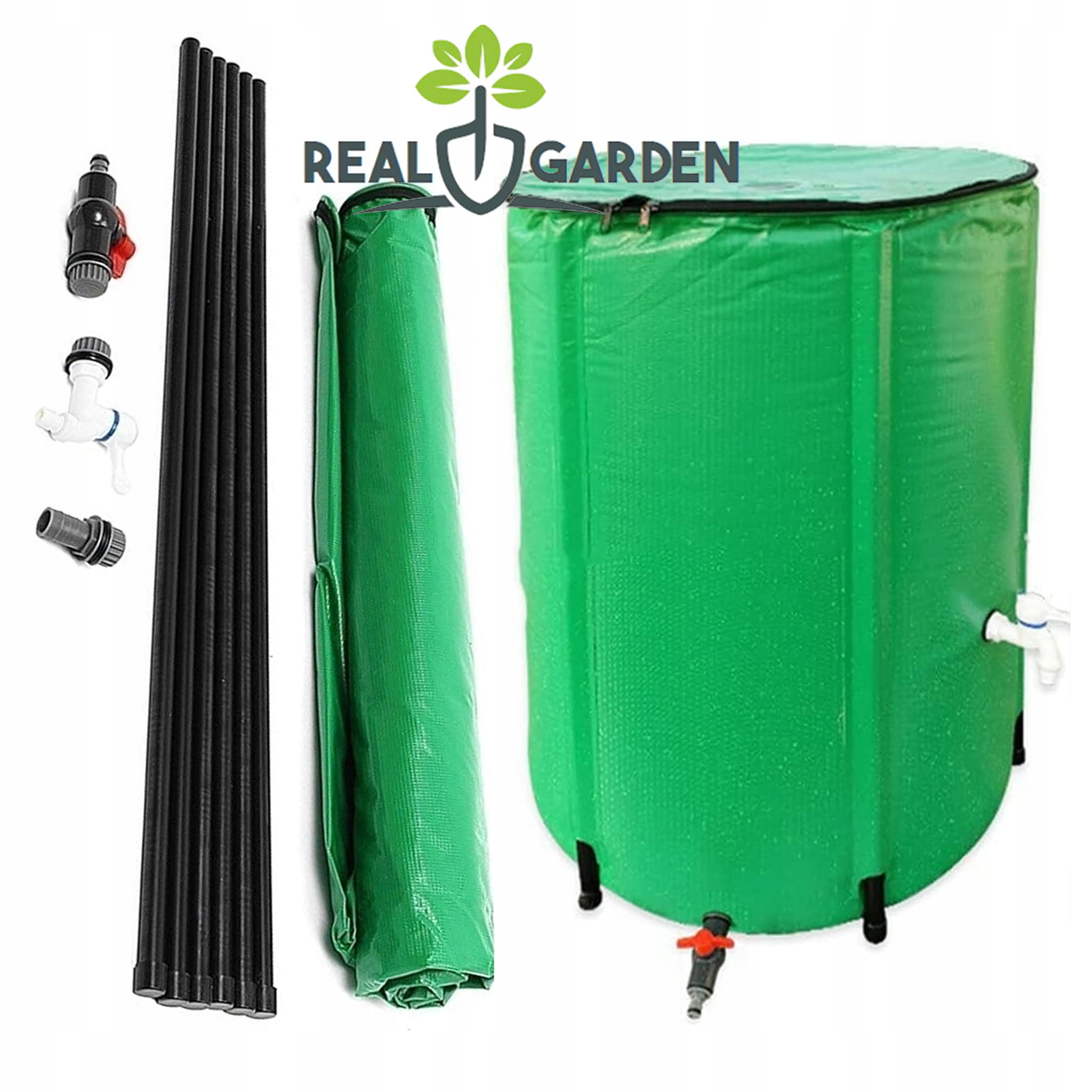 Faltbarer, flexibler Regenwassertank mit eingebautem Wasserhahn und Überlaufventil. Entwickelt, um beispielsweise aus Dachrinnen abfließendes Wasser zu sammeln, das dann zum Bewässern des Gartens, von Topfpflanzen oder zum Autowaschen verwendet werden kann.