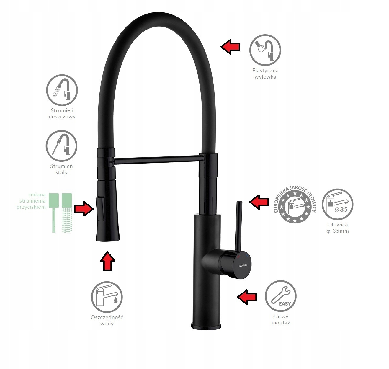 Der SHIRE-Wasserhahn zeichnet sich durch außergewöhnliche Benutzerfreundlichkeit und originelles Aussehen aus. Es verfügt über einen praktischen, flexiblen Auslauf und einen praktischen Wasserflussschalter.