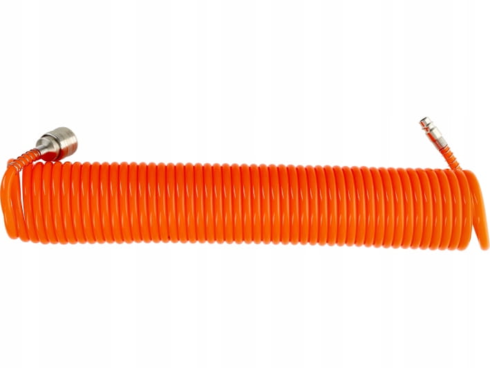 Spiraldruckschlauch aus flexiblen und widerstandsfähigen Materialien (Polyurethan). Dank der verwendeten Materialien zeichnet sich der Schlauch durch hohe Flexibilität und erhöhte Kältebeständigkeit aus. Das Spiraldesign erleichtert das Manövrieren und Aufrollen, ohne dass es zu Verhedderungen kommt. Der Schlauch ist ideal für den Anschluss von Druckluftwerkzeugen an einen Kompressor und sorgt für einen effizienten Luftstrom und Langlebigkeit im täglichen Gebrauch.