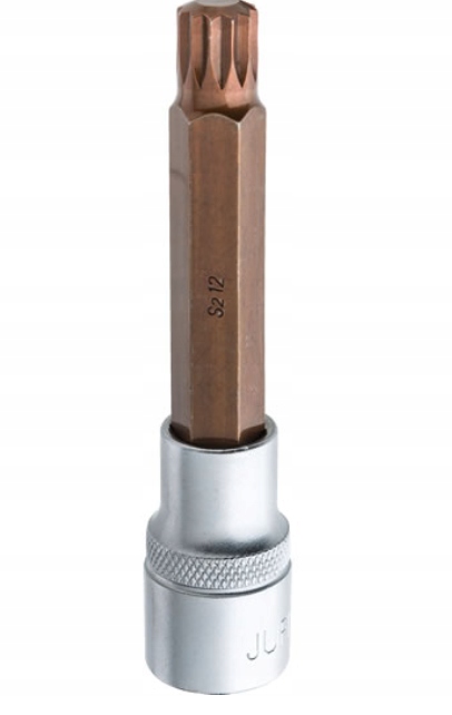 Spline-Spitze auf 1/2"-Stecknuss, Größe M12, 100 mm lang. Stecknuss aus widerstandsfähigem Chrom-Vanadium-Stahl. Sechskantkopf aus hochwertigem S2-Legierungsstahl.