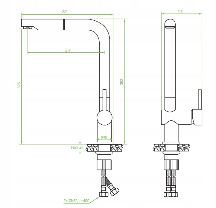 Die LUNA-Serie ist Granitspülen gewidmet. Die Farben der Armaturen entsprechen den gängigsten Spülenoberflächen: Weiß, Beige, Grau und Schwarz, sodass Sie ein perfekt aufeinander abgestimmtes Set zusammenstellen können. Der praktische, ausziehbare L-förmige Auslauf ermöglicht ein einfaches Spülen von Geschirr auch bei großen Abmessungen. Ein weiterer Vorteil der Serie ist die Low-Flow-Klasse, die Wasser spart und die Verbrauchskosten senkt.