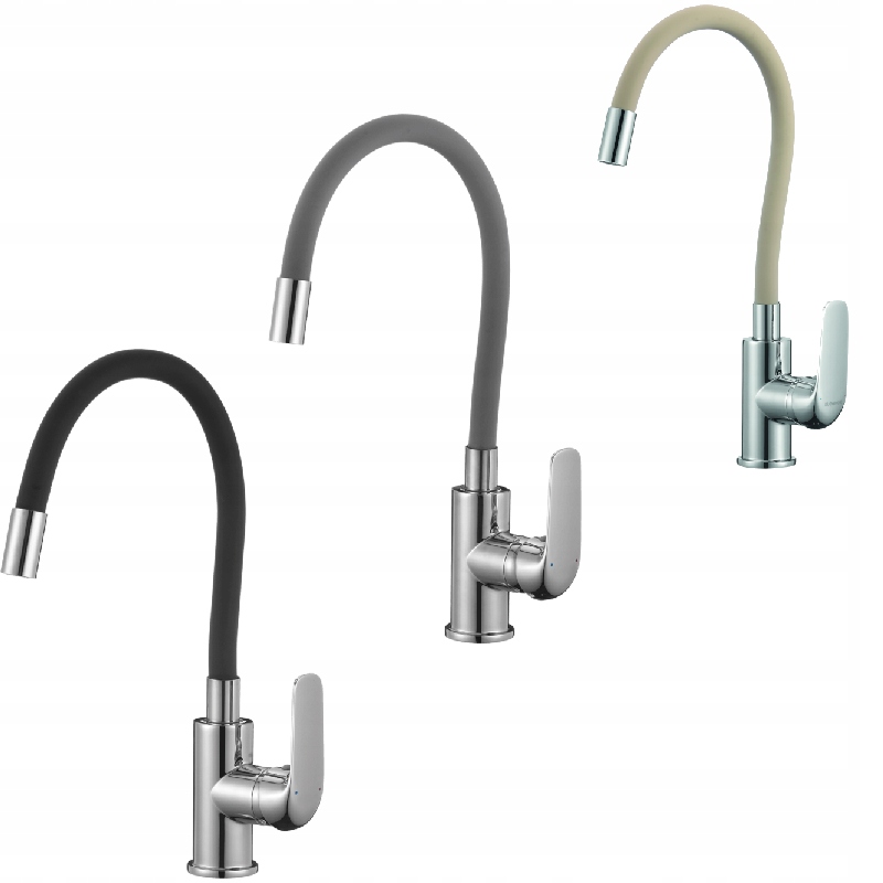 Elza - ein Küchenangebot für alle, die neben ihrer Funktion eine interessante Ästhetik erwarten. In zwei Modellen erhältlich, besticht die Serie durch ihre Oberflächen. Das sechste Modell verfügt über einen verchromten Armaturenkörper und drei Gummiausläufe zur Auswahl, d. h. beige, grau und schwarz. Das Wandmodell der Elza Armatur präsentiert schwarze Ausläufe mit schwarzem oder verchromtem Korpus. Der flexible Auslauf ist ein Garant für die Erleichterung der Küchenarbeit. Interessantes Design lässt die Spülenumgebung modern aussehen.