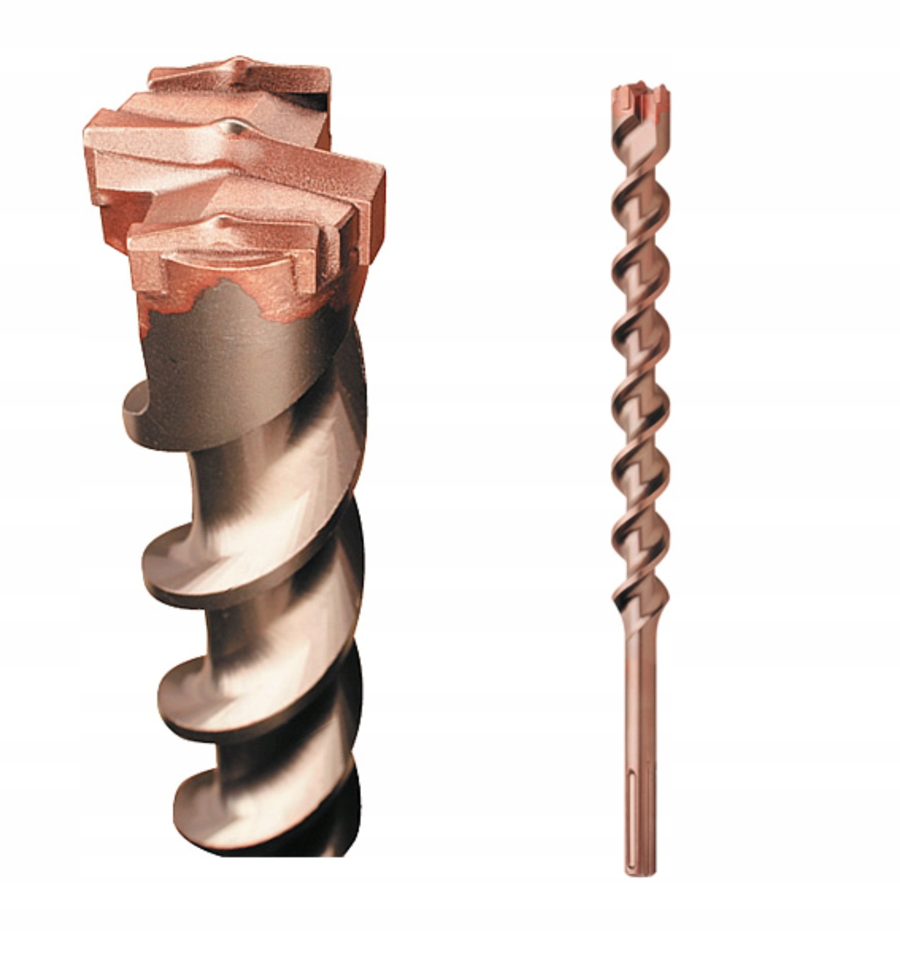 Hammerbohrer mit einem selbstzentrierenden 3-Blatt-Unikatkopf mit 6 Schneidkanten für schnelles Eintauchen und Erstellen eines konzentrischen Lochs, das auf den Durchmesser kalibriert ist.