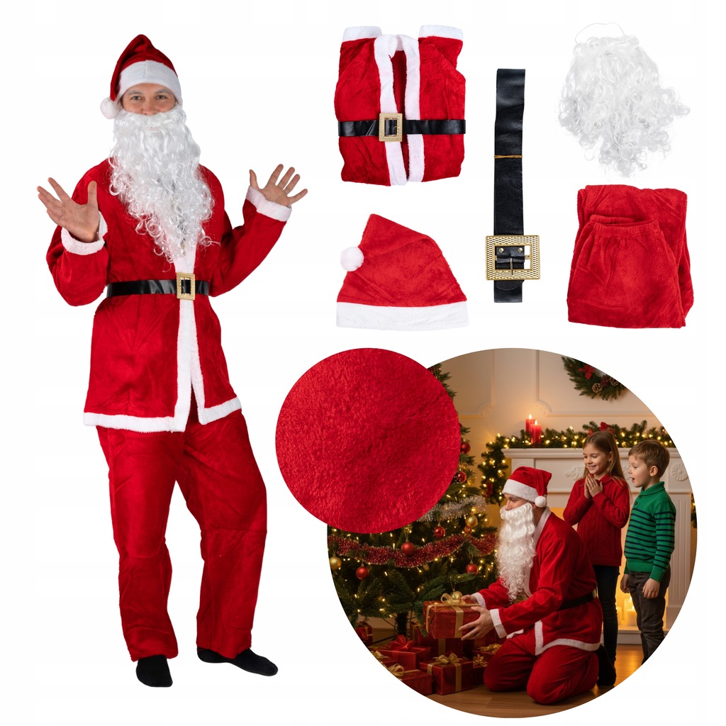 Ein komplettes Weihnachtsmann-Set, bestehend aus 5 Teilen, mit dem Sie selbst zum Weihnachtsmann werden können. Hergestellt aus hochwertigen Materialien, besticht es durch sein elegantes Aussehen und die Liebe zum Detail.
